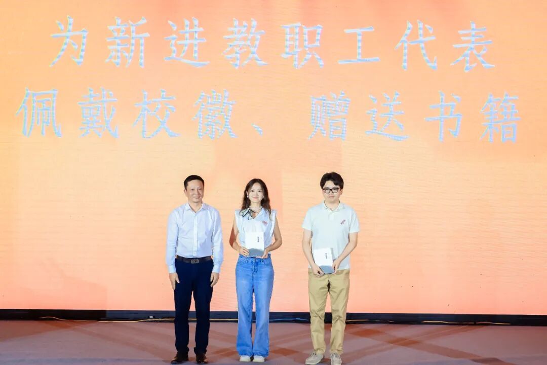 中国美术学院院长余旭红为新进校教职工代表赵熙淳、曹青莞佩戴校徽、赠送书籍