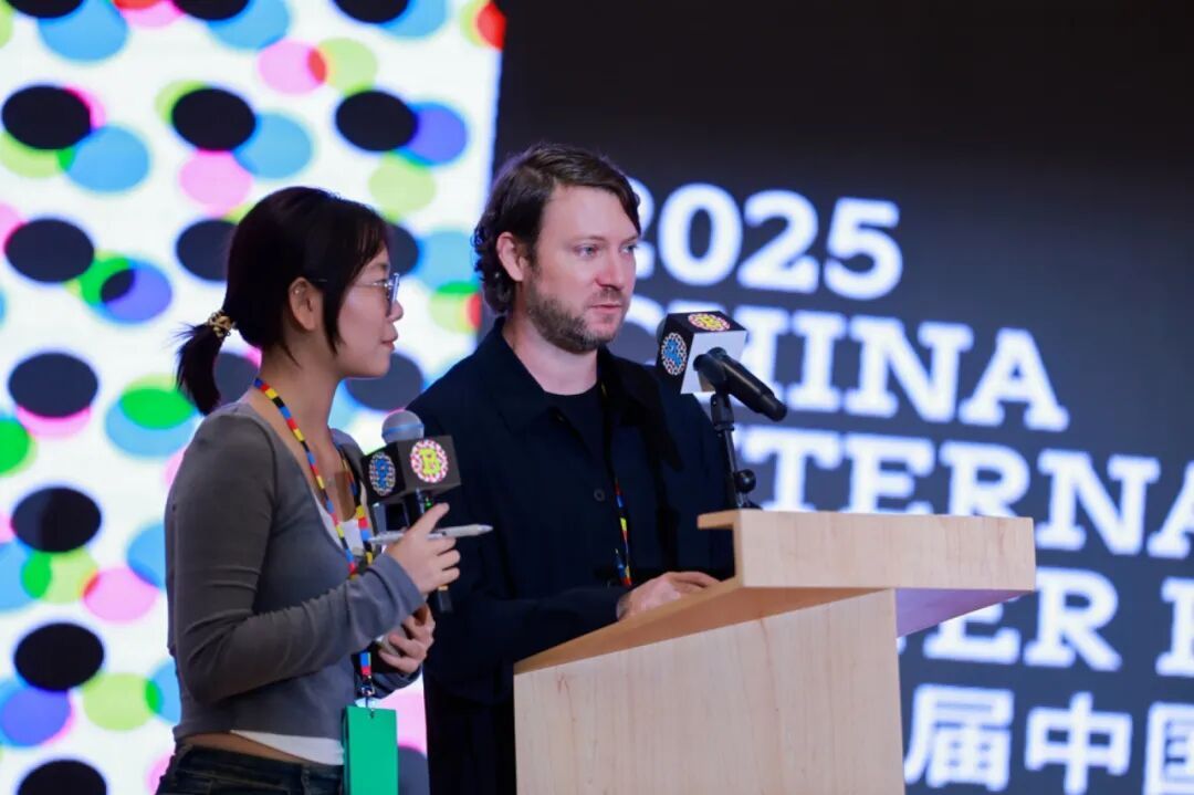 本届双年展终评国际评审代表,瑞士Balmer Hählen设计工作室创始人、AGI会员Yvo Hählen伊沃·哈伦(右)发言