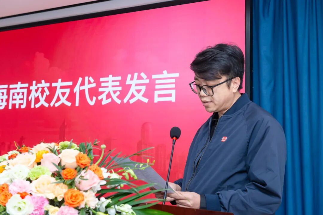 2002级校友于晨作为校友代表发言,他提到母校 “兼容并包”“艺术为人民” 的精神理念对自身学习生活的积极影响,在校求学的经历是人生中宝贵的财富。他表示,海南自贸港正成为国际艺术新坐标,为校友们提供了广阔舞台,大家要用专业所长,将国美精神与海南特色相融,让艺术成为自贸港最鲜活的文化名片。校友会既是情感港湾也是事业桥梁,未来愿以校友会为纽带,传承母校精神,深耕艺术创作,推动文化交流,搭建母校与海南艺术教育合作桥梁,在自贸港书写国美人新篇章。