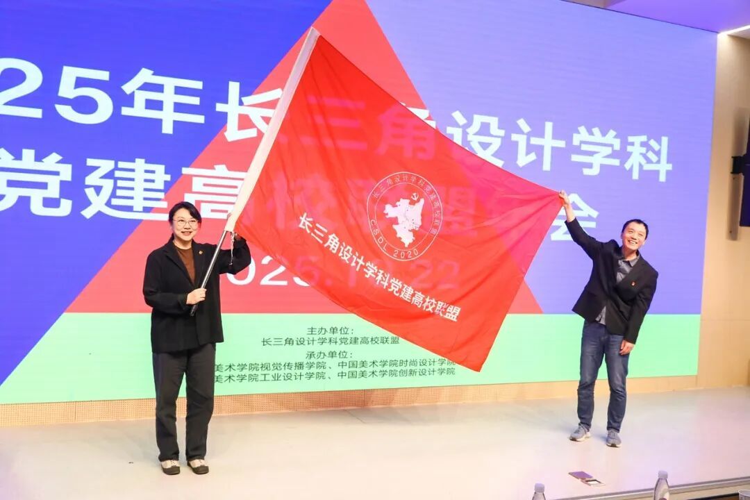 2026年联盟轮值主席单位中国美术学院工业设计学院党委书记刘征(右)上台交接会旗仪式、同济大学设计创意学院党委副书记张雪青(左)担任下届主办方