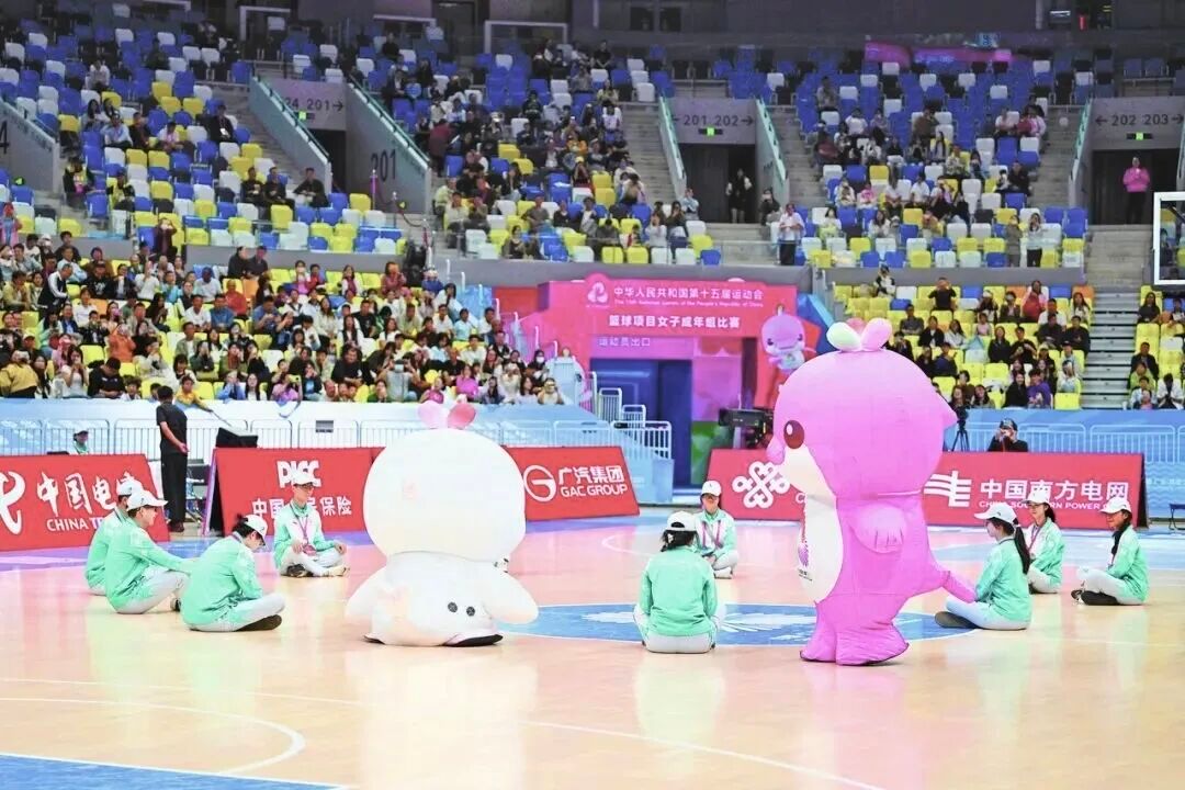 “喜洋洋”(右七)与“乐融融”(右四)在全运会比赛间隙为观众表演节目