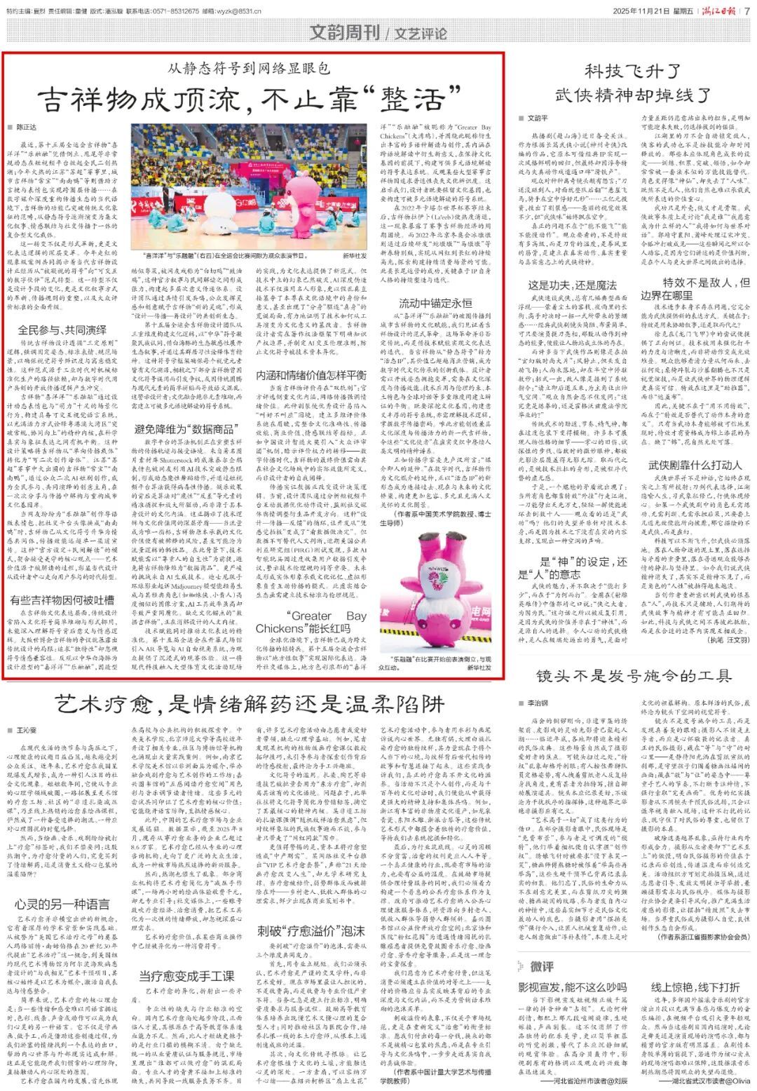 最近,第十五届全运会吉祥物“喜洋洋”“乐融融”凭借倒立、甩尾等非常规动态在短视频平台掀起全民二创热潮;今年火热的江苏“苏超”赛事里,城市吉祥物“常宝”“南南鸭”等则借助方言梗与表情包实现跨圈层传播……在数字媒介深度重构传播生态的当代语境下,吉祥物的功能已突破传统文化象征的范畴,从静态符号逐渐演变为集文化叙事、情感联结与社交传播于一体的复合型文化载体。