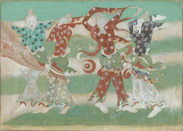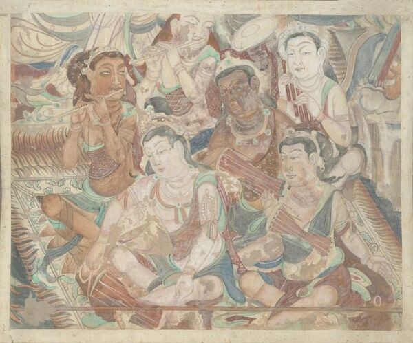 敦煌之美源于世界的相遇,物的汇集,感官的交响。“琵琶起舞换新声,总是关山旧别情。撩乱边愁听不尽,高高秋月照长城。”行旅风景即是生命际遇,在陌生之地,陌路相交,与陌客同行。分不清千年前经过此地的胡人是客,还是说今朝的我们是客——时空无尽,我们的面容与胡客的面容重叠——“流水今日、明月前身。”