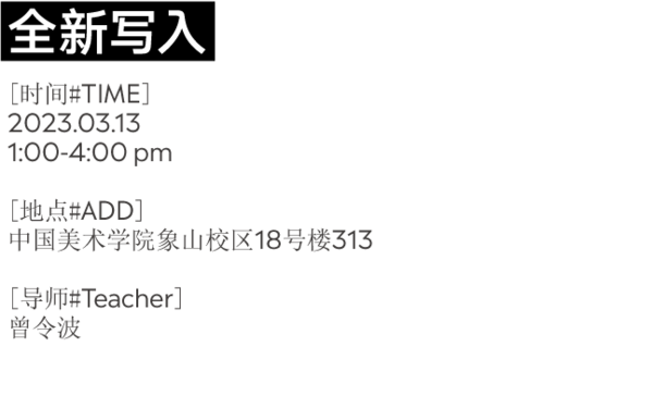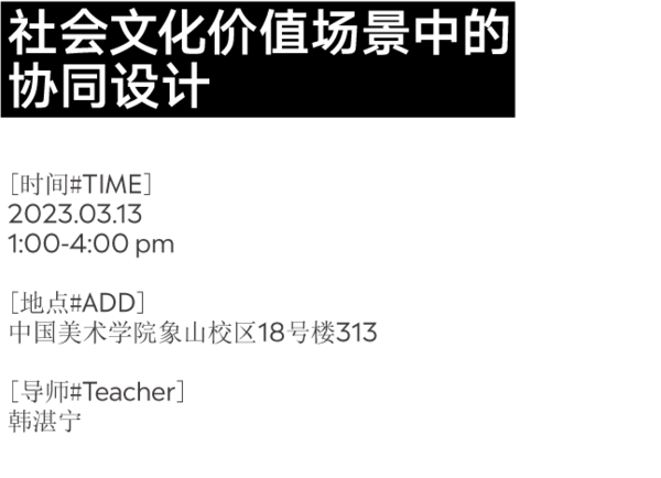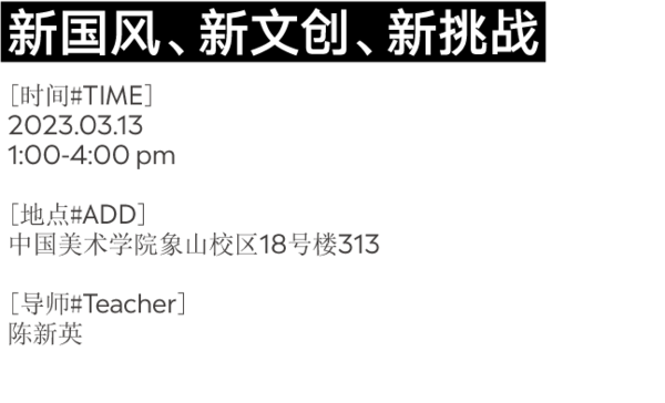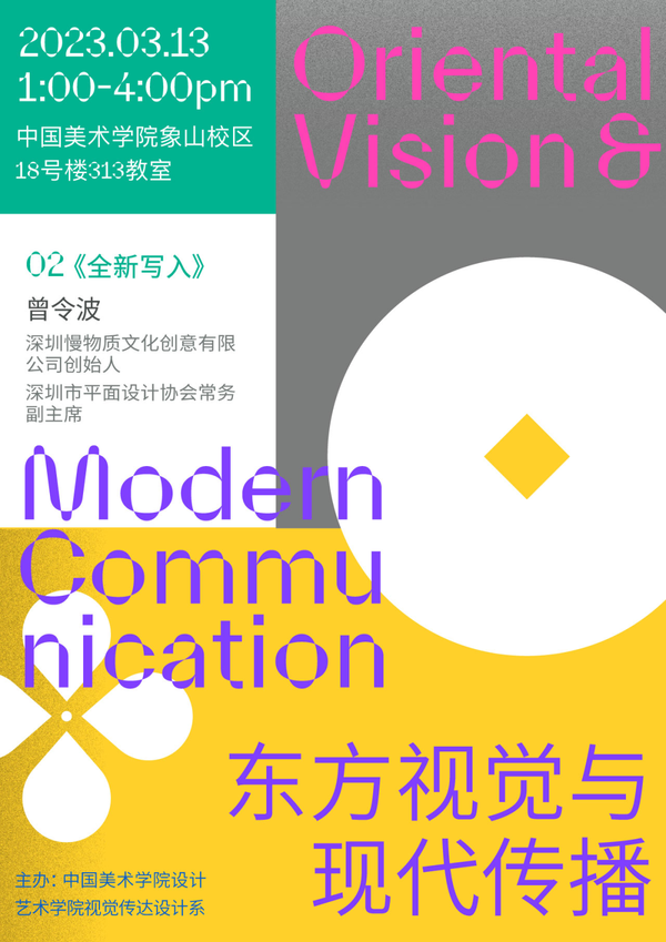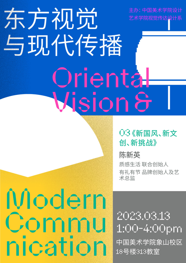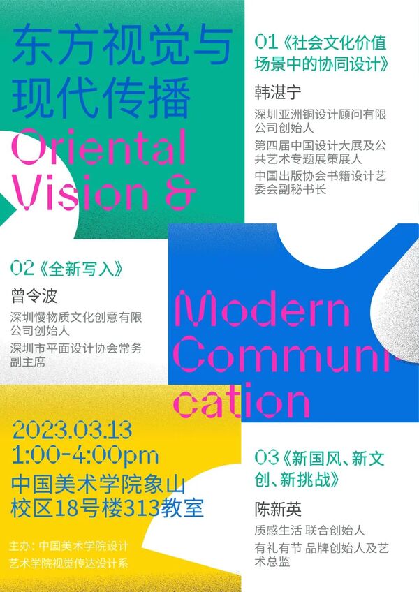 《东方视觉与现代传播》是视觉传达设计系二年级为期五周的专业设计课程。通过综合研究东方美学特性、中国传统思维方式以及多元文化视野中的东方设计,视觉化系统性的学习东方视觉设计的要素、对比视觉语意的异同,掌握东方视觉元素语言的设计与应用方法。本期课程视觉传达设计系非常荣幸邀请到了韩湛宁、曾令波、陈新英三位老师为同学们带来关于东方设计的实践与思考。
