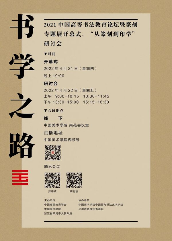 为贯彻落实党的十九届六中全会精神,深入学习习近平总书记关于文化文艺工作的重要论述,进一步弘扬陆维钊先生的艺术精神和教育理念,中国高等教育学会、中国美术学院、浙江省平湖市人民政府将共同主办“书学之路——第四届中国高等书法教育论坛”,论坛依托“中国高等书法教育成果系列之篆刻专题展”、“从篆刻到印学”研讨会,构建书法专业教育实践和创作展示交流的平台,展现近年来书法专业学科建设和教育成果。