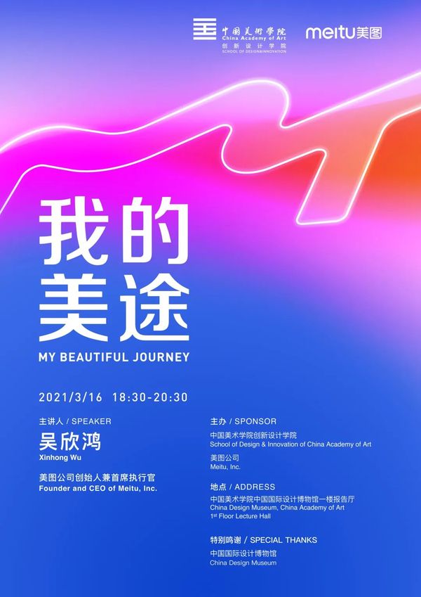本次“我的美途”讲座请到美图公司创始人兼CEO,吴欣鸿。他作为一名曾经的国美学子,现在的“美”的创业者,希望与大家分享自己是如何发现并走上自己的“美途”。