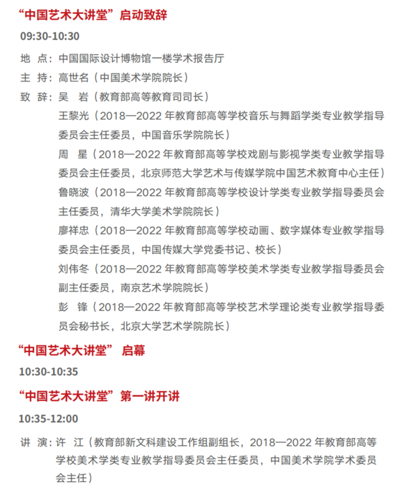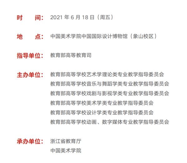 为深入贯彻落实习近平总书记关于教育和文艺工作的重要论述,贯彻落实党的十九届五中全会精神,全面贯彻全国教育大会精神,切实落实新时代全国高等学校本科教育工作会议要求,加快推进新文科建设,“中国艺术大讲堂”启动仪式将于2021年6月18日在中国美术学院象山校区中国国际设计博物馆举行。“中国艺术大讲堂” 以“发动名校、汇聚名家、展示名作、提升名望”为要旨,光耀中华文化、推进社会美育。