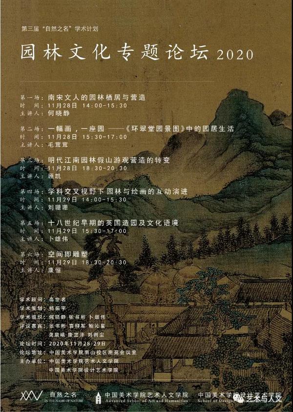 鉴于以上的判断,艺术人文学院联合设计艺术学院,邀约国内多位专业研究的学者,筹划举办第三届“自然之名”学术计划,旨在以系列专题讲座+专题评议的方式,在一个开放的视野进行跨学科、多领域的园林文化探讨。故决定于2020年11月28日和29日,在中国杭州西子湖畔举办“园林文化专题”论坛,并将编辑出版相关论文集。“自然之名”学术计划创建于2014年,旨在为当代风景/山水画的创作与理论研究提供一个思想交流与碰撞的学术平台。“自然之名”同时是一门开放性的课程实验与教学探索,试图形成一个理论与实践、知识与经验的共同体。“自然之名”也是一个综合的策展方案,将不定期举行以风景/山水画为中心的主题展览与专题研读。本届论坛的学术召集人是中国美术学院艺术人文学院院长杨振宇教授。