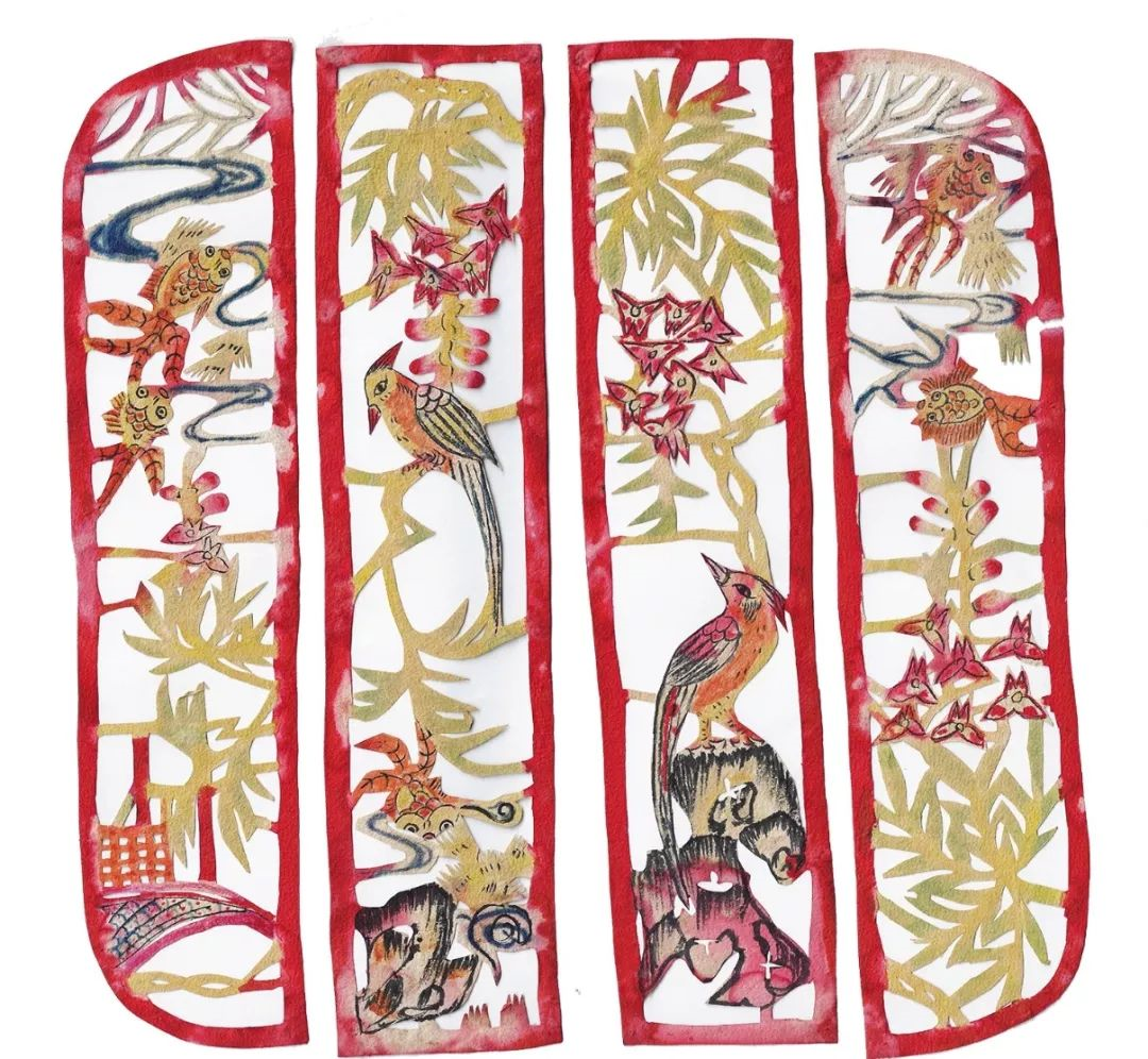 “民艺中国——剪纸系列展”共分为四个部分:一、燕尾巧裁春夏秋冬;二、纸中寻梦东西南北;三、镂空成纹喜上眉梢;四、福纸千年瓜瓞绵绵。剪纸艺术讲究喜庆、吉祥,所谓“有图必有意、有意必吉祥”。“民艺中国——剪纸系列展”的空间剪纸布置为栾旭初、周爱军所作。艾虎系列门笺有护生、镇宅、避邪之意,其图系在民间流传较广,倍受欢迎。