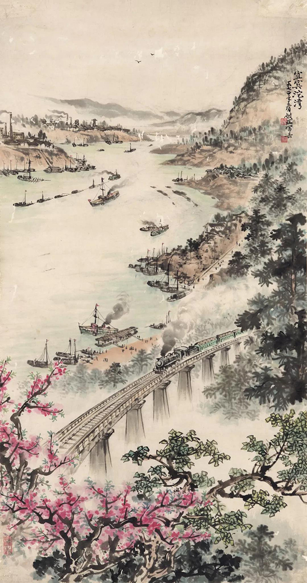 《宜宾沱湾》 唐献瑞 纸本设色 90x46cm 1974年