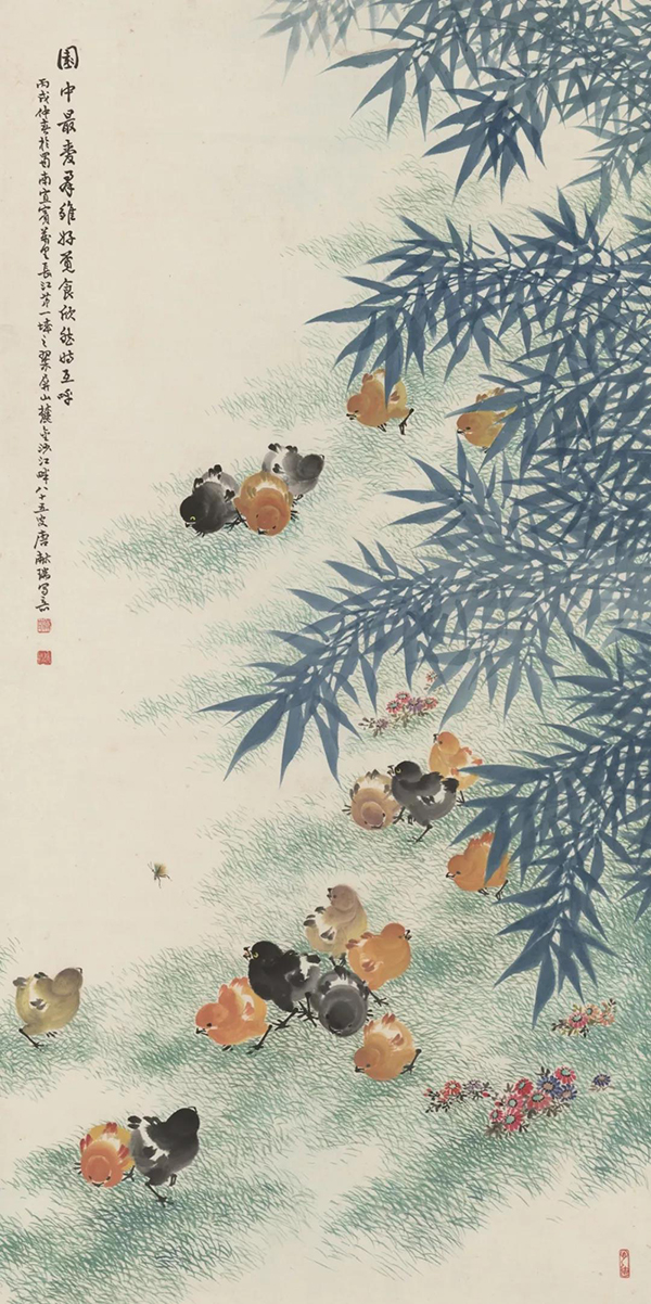《园中最爱群雏好》 唐献瑞 纸本设色 100x57cm 2006年
