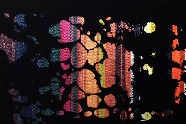 The flow in the river is the tears of innocence(局部) 刘嘉琛 2017 89 x 224x 30 cm 综染色竹纱,手工提花编织,木结构,Led灯,压克力板 hand woven with dyed bamboo yarn,wood structure case,LED lights,acrylic