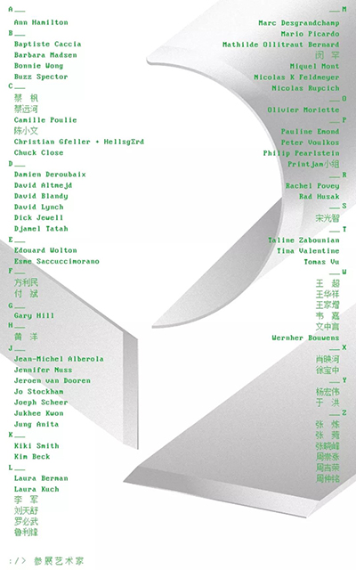 Ann Hamilton、Baptiste Caccia、Barbara Madsen、Bonnie Wong、Buzz Spector、蔡枫、蔡远河、Camille Poulie、陈小文、Christian Gfeller + Hellsg?rd、Chuck Close、Damien Deroubaix、David Altmejd、David Blandy、David Lynch、Dick Jewell、Djamel Tatah、Edouard Wolton、Esme Saccuccimorano、方利民、付斌、Gary Hill、黄洋、Jean-Michel Alberola、Jennifer Nuss、Jeroen van Dooren、Jo Stockham、Joeph Scheer、Jukhee Kwon、Jung Anita、Kiki Smith、Kim Beck、Laura Berman、Laura Kuch、李军、刘天舒、罗必武、鲁利锋、Marc Desgrandchamp、Mario Picardo、Mathilde Ollitraut Bernard、闵罕、Miquel Mont、Nicolas K Feldmeyer、Nicolas Rupcich、Olivier Moriette、Pauline Emond、Peter Voulkos、Philip Pearlstein、Printjam小组、Rachel Povey、Rad Husak、宋光智、Taline Zabounian、Tina Valentine、Tomas Vu、王超、王华祥、王家增、韦嘉、文中言、Wernher Bouwens、肖映河、徐宝中、杨宏伟、于洪、张炼、张菀、张晓峰、周崇涨、周吉荣、周仲铭