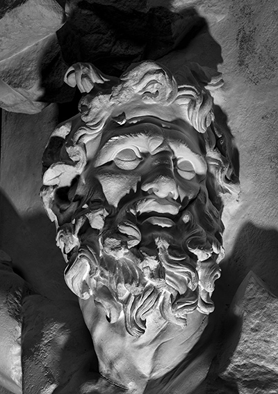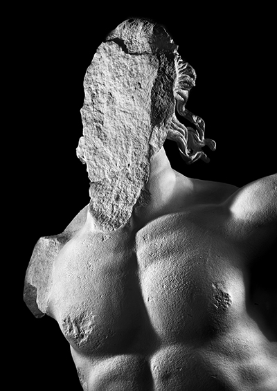 这听起来似乎不合逻辑。在镜头里,那些从整体中剥离的局部既显示了希腊雕塑家的精湛技艺,又展现了这件杰作残破的美感。同时在光影的作用下,又让这件去色的浮雕回到了雕塑最纯净的面貌,并通过光影的对比创造了一幅新的画面——去势巨人的双腿以及面目模糊的诸神。最终,这一系列摄影作品聚焦于一场矛盾。诸神与巨人的对抗,理想与粗糙现实的碰撞。黑格尔笔下希腊雕塑所追求的 “人体的永恒、普遍、尺度”,也被摄影作品中散发的个体性和痛苦感中和了。