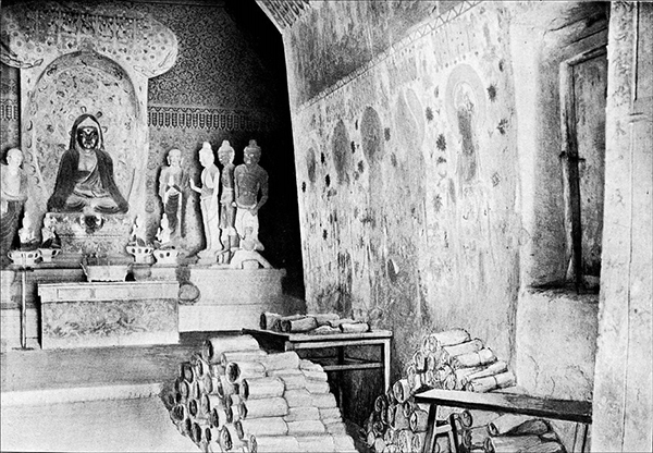 斯坦因于1907年5月在藏经洞口挑选文物的场景
