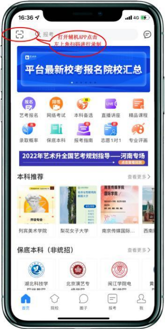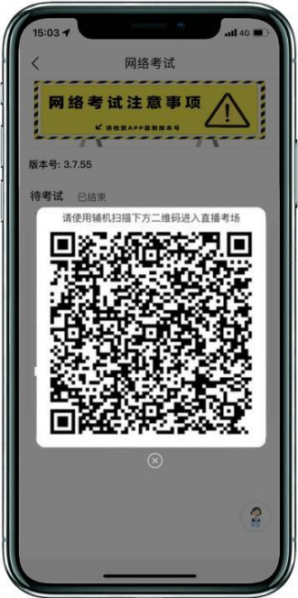 点击“正式考试”按键,弹出二维码(如图5第一张)。此时需要用辅机打开“艺术升”APP(注意:辅机只打开“艺术升”主页,不要登录“艺术升”),在辅机“艺术升”首页左上角打开扫描工具“[-]”,辅机扫描主机上弹出的二维码(图5第一张),辅机扫码成功后进入监考状态(如图6)。