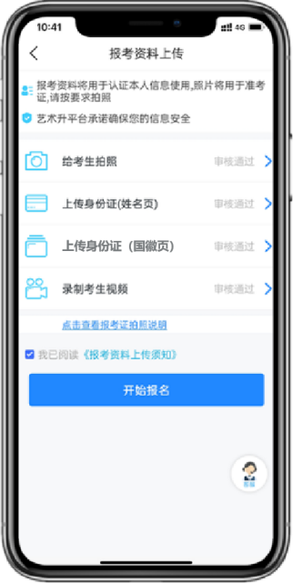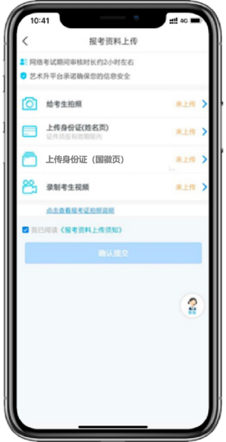 考生点击“艺术升”APP报考页,须于5月23日前在“上传报考资料”栏目中完成肖像信息采集工作,具体采集信息包括:拍摄免冠一寸照、上传身份证姓名页、上传身份证(国徽页)、拍摄5秒语音视频,完成相关信息采集后并确认提交,待审核通过后在规定时间内打印准考证,参加后续网络远程考试(如图2)。