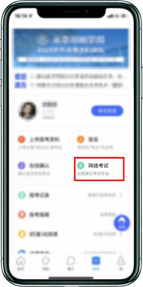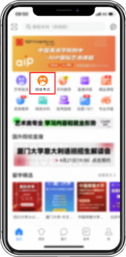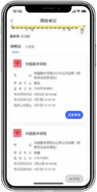考生使用身份证号和密码登录“艺术升”APP(初始密码为身份证号后六位),在APP首页或报考页面选择“网络考试”,进入“中国美术学院特殊专业技术岗位公开招聘实践为主类专业展示考试”界面(如图4)。