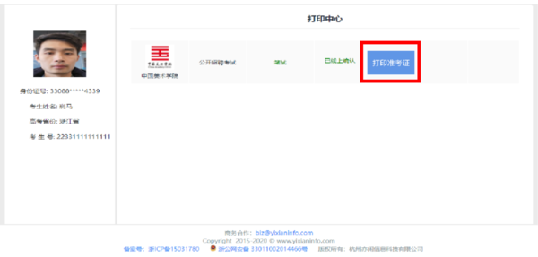 第三步:考生于2022年5月28日至5月31日期间用电脑登录“艺术升”网站(https://user.artstudent.cn),点击"打印中心",查看并打印准考证(如图3)。
