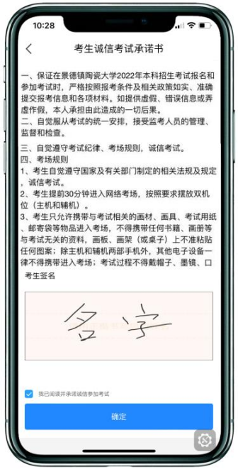 (四)辅机连接成功后,主机将提示考生阅读《考生诚信考试承诺书》,考生须逐条仔细阅读后,勾选“我已阅读并承诺诚信参加考试”,同时签字确认(如图8)。