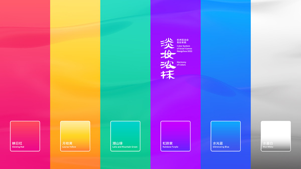 作品主题概念“淡妆浓抹”,出自宋代诗人苏轼的诗句“欲把西湖比西子,淡妆浓抹总相宜”。六个主题色系,也都分别对应了一句描写杭州的诗词。虹韵紫、映日红、月桂黄、湖山绿、水光蓝、水墨白六种颇具江南色彩的颜色,既包含了葱郁湖山的自然生态,也融汇了创新活力的运动激情。