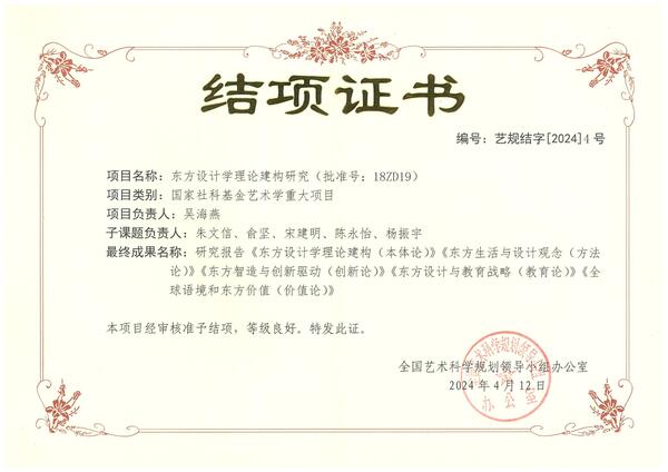 近日,由我校设计艺术学科牵头组织,吴海燕教授担任首席专家的国家社科基金艺术学重大项目《东方设计学理论建构研究》,经全国艺术科学规划领导小组办公室审核通过,鉴定良好,准予结项。该项目于2018年立项,历时五年有余,得到了许江教授、金一斌教授、高世名教授、杭间教授等学院领导和专家的支持和指导,凝聚了我校多名教师以及业内外专家的研究心血及成果。