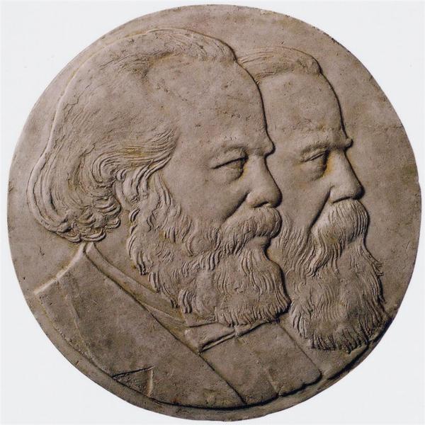 A sculpture of Karl Marx and Friedrich Engels is on display.