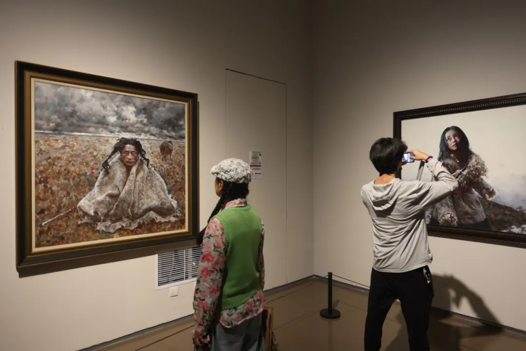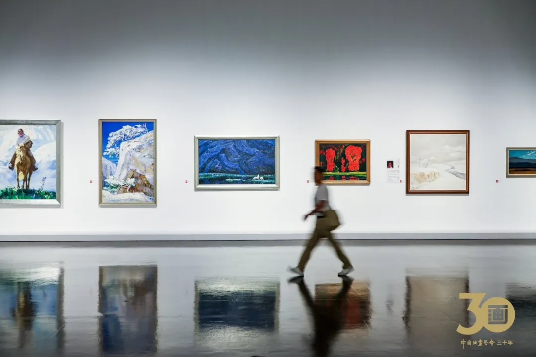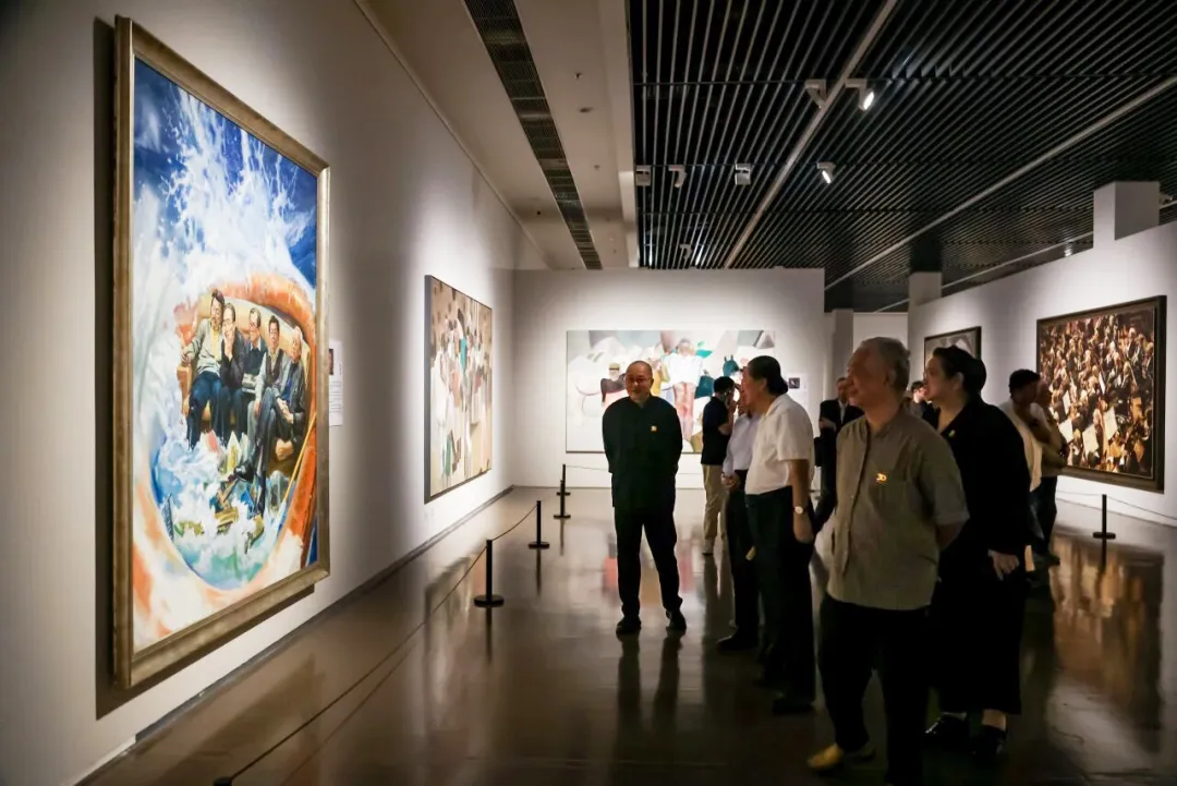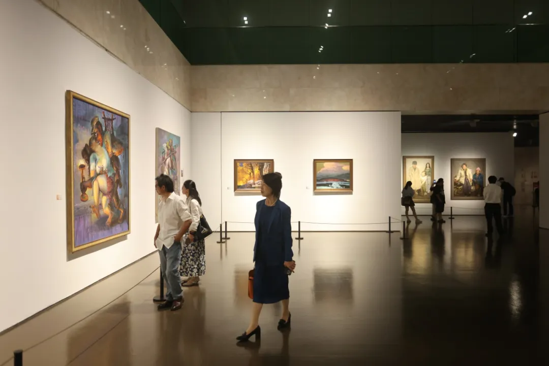 开幕式后,全体与会者共同参观展览。本次展览分为“史诗高华”“人民纪神”“山河揽胜”“草木寄心”四大板块,共展出370位中国油画家的800余件作品。本次艺术展不仅汇集了当代中国油画创作最具代表性的艺术家们,也汇聚了近年脱颖而出的部分优秀青年油画家,集中呈现了中国油画学会成立三十年来不同时期的油画家经典作品,全面展现了中国油画的整体创作实力。作为近年来国内规模最大的油画专题展,展览尤其强调艺术家语言探索的研究力度,以此揭示中国油画在坚持文化自信下的自足与自觉发展道路。