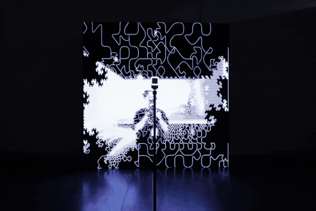 郭锐文的算法生成艺术作品《5158》标志着纤维艺术媒介中介的创新性延伸,从传统的布面走向了数字空间。这件作品并非简单的数字图像,而是艺术家对纤维艺术核心概念——编织、纹理和重复——在算法层面的全新演绎。《5158》最初源于对Heighway龙形曲线平面镶嵌可行性的研究。郭锐文巧妙地将像素数据导入生成系统,控制曲线内每条线段的折叠与否,从而将图像信息转化为算法的指令。曲线形态通过递归方式构建,像素区域的综合亮度被映射为迭代次数,驱动龙曲线的折叠变形。最终,每个镶嵌中的龙曲线呈现出摄像头实时采集的具象画面,实现了纤维艺术在数字空间中的动态呈现,模糊了传统媒介与数字媒介之间的界限。