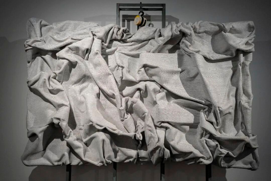 王小松则通过其经典的艺术语言“褶皱的布面”展现了关于“多维度绘画”的探索,其材料、触感、方向、明暗、色彩等元素的空间变化,共同展现出了艺术本身的动态性和可塑性,同时在软与硬、平面与立体的多面性中构建起矛盾纠结的独特视觉互动。王小松在接受凤凰艺术采访时提及,此幅作品灵感来源自毕加索的《格尔尼卡》,是对其立体而抽象的呈现。王小松认为,至高的绘画应能唤起强烈的触感、拥抱感和心灵震撼,引导观者以全新视角解读秩序的文化内涵。他尤其强调多维度绘画是对弯曲空间的探索,是对欧氏几何在弯曲空间中的逆向表现。