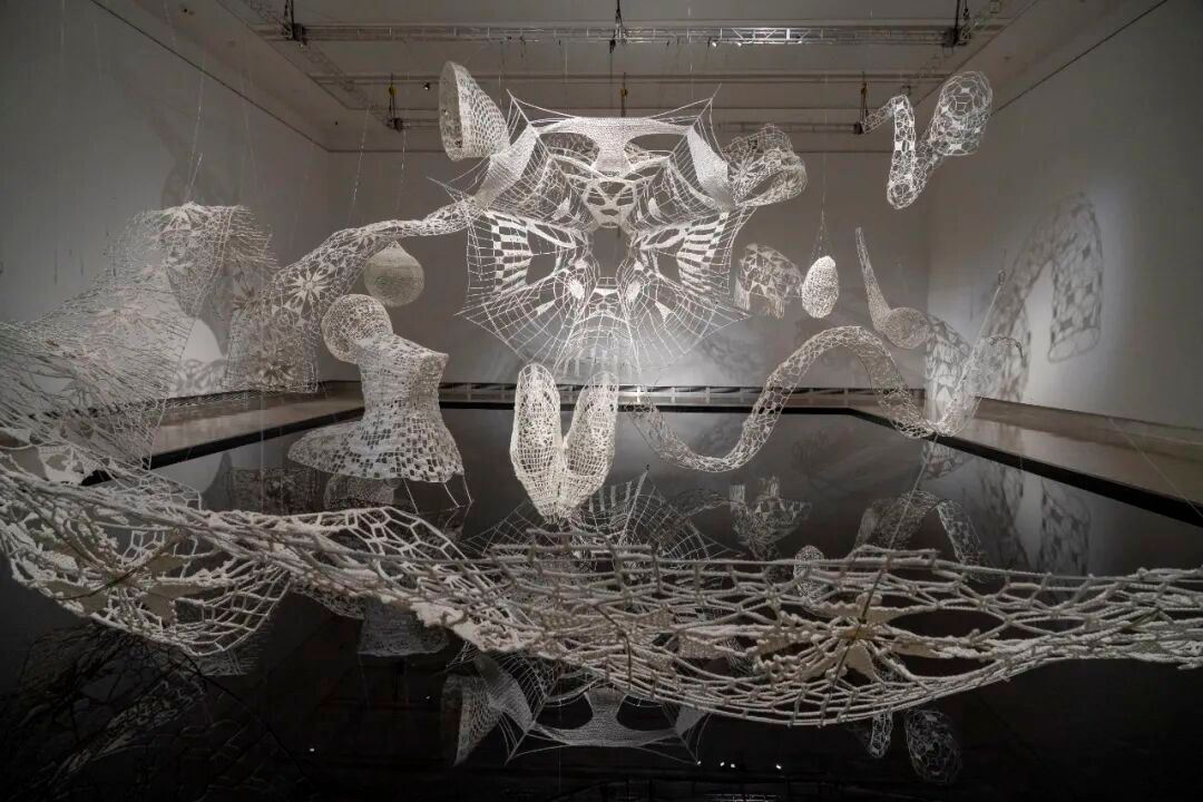 展览特别委托Choi+Shine艺术小组创作的巨型蕾丝装置《缩地》,堪称本次的核心亮点。此件作品以中国十二生肖为灵感,邀请杭州来自各行各业的110名志愿者共同参与编织,正如作品名“DISTANCE”被译为“缩地”的深意。钩针的每一次牵引,都在消弭时空的沟壑,让百年前的萧山花边女工与今日的志愿者在针线轨迹中隔空对话;让西湖亭阁的飞檐翘角、生肖石的集体想象,通过蕾丝的经纬凝成可触摸的文化基因库;更让人与人之间、大地与星空之间原本被岁月尘封的共鸣与期待,重新被针尖唤醒、编织为光年尺度下的亲密叙事。