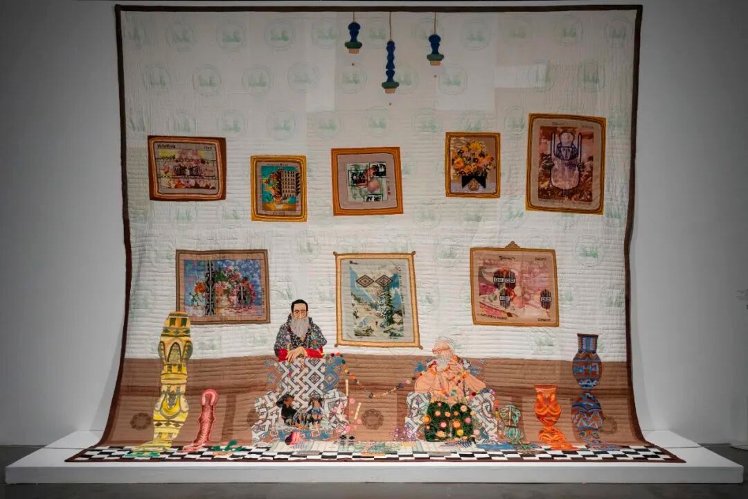 在《Comechiffones》系列中,莱昂纳多·奇亚奇奥和丹尼尔·贾诺内(Chiachio & Giannone)则以充满个人色彩的方式重新反思了在全球化进程中关于民族身份的问题。奇亚奇奥的曾祖母是阿根廷科尔多瓦省和圣路易斯省的Comechingones原住民,这激发了他们创作这幅“家庭合影”。作品中,CH&G与爱犬一同出现,背景是他们精心构筑的纺织品和陶瓷世界,这些物件既象征着欧洲文化的影响,也蕴含着对原住民文化的敬意,并向布朗库西的雕塑艺术致敬。《Comechiffones #3》以独特的视角,审视了文化交融如何塑造我们的身份认同。