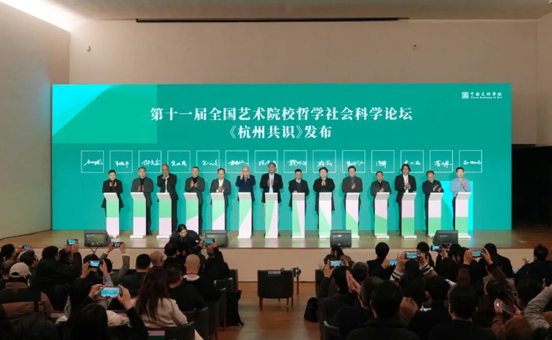 论坛形成并发布了《第十一届全国艺术院校哲学社会科学论坛“杭州共识”》。《杭州共识》明确,艺术院校构建中国哲学社会科学自主知识体系,要坚持以人民为中心的创作导向,发显文化艺术力量、书写人民奋斗史诗;要增强文化自信,持续中国艺术语言建构,彰显艺术作为感知之学对人类知识边界拓展、民族文化自信铸造的独特贡献;要支撑文化强国,以艺术创造助力产业创新,促进新质生产力发展,担当国家创新驱动发展战略的重要支撑;要推进文明互鉴,奋力书写世界艺术史,以中国艺术精神和中国艺术力量,参与塑造世界艺术新格局。《杭州共识》的发布,为全国艺术院校哲学社会科学发展提供了行动指引,推动艺术院校在自主知识体系构建上迈出坚实步伐。