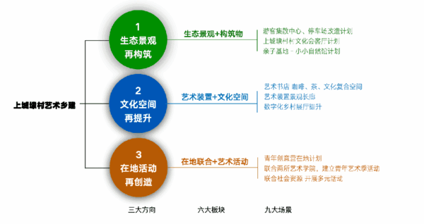 以打造“最美中国茶村”,突出茶产业和乡村旅游业两个重点,让茶村“处处都是景,四季皆可游”为目标的艺术乡建计划。毕学锋提出了以“三大方向、六大关系、九大场景”为引领的艺术乡建再提升计划:一是生态景观再构筑,思考生态景观和构筑物的关系,从自然生态的创新再利用,通过生态与艺术的结合,创造自然交融的艺术体验,为乡村注入更为丰富的艺术氛围,发挥生态优势来扩大社会融合。二是文化空间再提升,思考文化空间内和外的关系,把文化空间形成具有城乡互动的粘合力,创造具有吸引力的文化旅游地,以此促进未来乡村多元产业发展与良性的创意生态。三是在地活动再创造,持续开展在地艺术活动的联合计划,以创新的活动机制推动乡村建设,激发乡村活力引入青年艺术群体,联合院校资源和社会资源在乡村落地的活动计划。