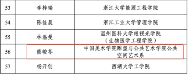 熊峻苓,中国美术学院雕塑与公共艺术学院硕士研究生,围绕习近平文化思想,以“艺术+自媒体”优势,提升乡村“颜值”打造文化胜地,助力青年网络聚地变身红色人气阵地。现任校团委副书记,获西部计划全国优秀志愿者、浙江省“研究生党员标兵”、国家奖学金、校优秀共产党员等 110 余项荣誉。