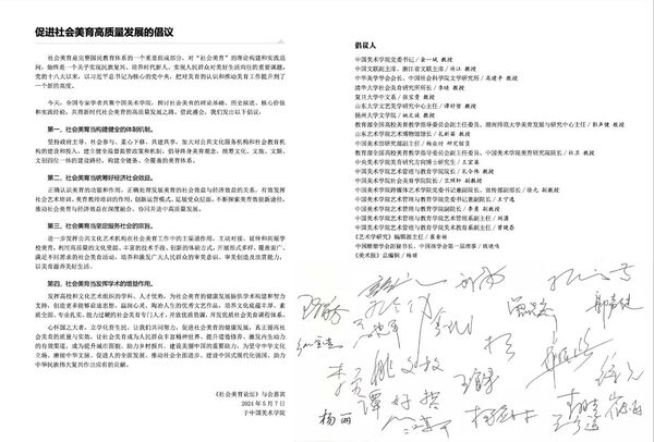 论坛上,与会嘉宾共同发起了《促进社会美育高质量发展的倡议》,指出社会美育是完整国民教育体系的一个重要组成部分,对“社会美育”的理论构建和实践追问,始终是一个关乎实现民族复兴、培养时代新人、实现人民群众对美好生活向往的重要课题。为促进社会美育高质量发展,应当构建健全的体制机制、统筹好经济社会效益、坚定服务社会的宗旨、发挥学术的增益作用,真正提高社会美育的质量与实效,让社会美育成为人民群众丰富精神世界、提升道德修养、激发内生动力的有效渠道,成为提升城市面貌、助力乡村振兴、建设美丽中国的重要助力,为坚守中华文化立场、赓续中华文脉、促进人的全面发展、推动社会全面进步、建设中国式现代化强国、助力中华民族伟大复兴作出应有的贡献。