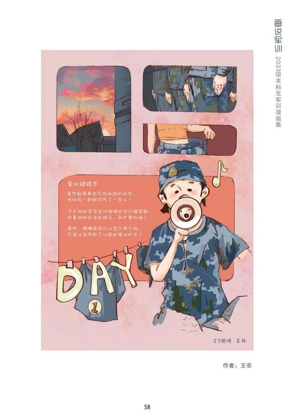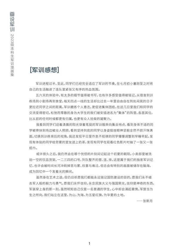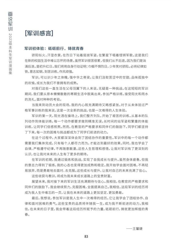 在这片训练场上,同学们不仅以汗水与热血为墨,书写坚毅与奋斗的篇章,更以画笔为翼,以文字为舟,描绘成长的轨迹,撰写青春的诗篇。本次军训还精心编印了《画说军训》,图文并茂地记录了同学们在军训中的所感所想,所思所获。