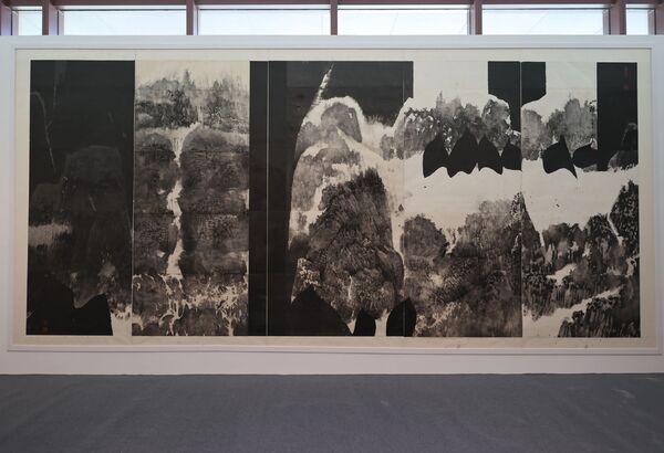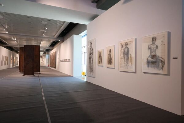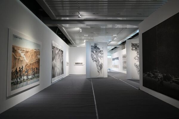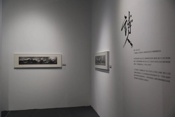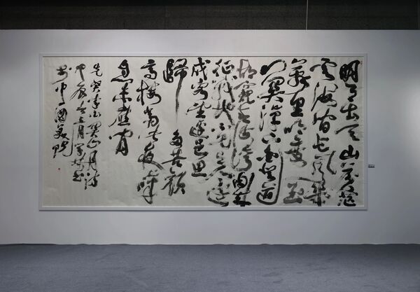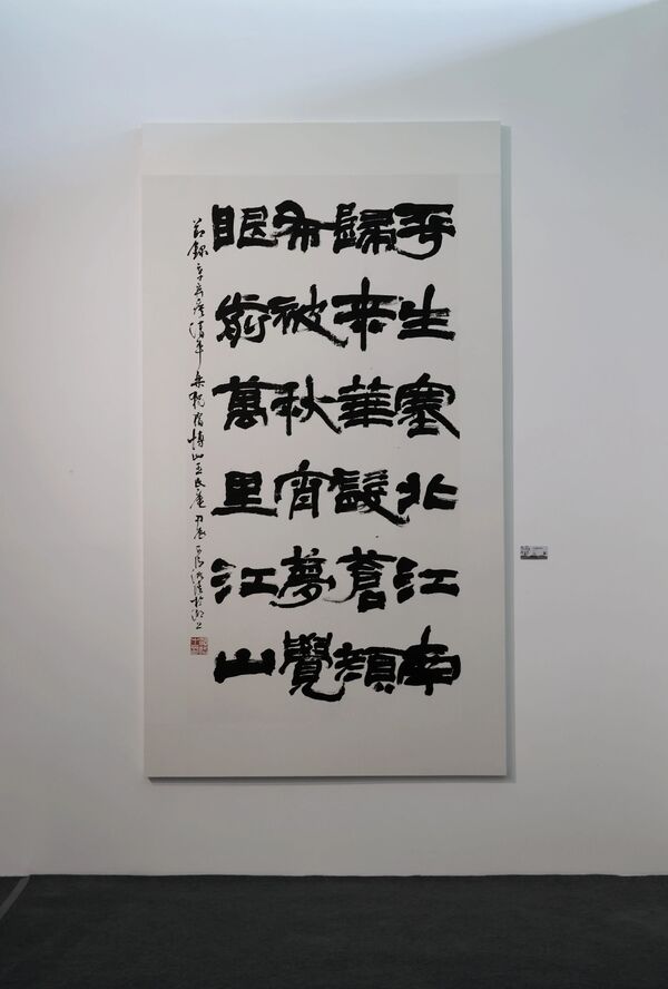 艺术家许江的《秋葵会否变红》用“葵”点燃心中意气,胸中块垒,诗意演绎一曲逶迤回荡、深沉奇崛的历史颂歌;曹晓阳作品《二十四节气系列》以木炭石墨划开⼈与天地自然间的坐标,山壑与水波在其中交合,流晕墨色穿湖山,飞烟气转望昆仑;艺术家闵学林的书法作品《关山月》潇洒恣肆,呈现龙蛇竞走的狂草之姿,尽显雄伟意境与盎然诗意;沈浩作品《平生塞北江南》,结体舒展、笔力沉劲,将辛弃疾的孤愤壮志之情跃然纸上,于笔墨流转之间俯仰纵横;艺术家刘海勇的胡杨系列将边塞胡杨古拙的枝干通过生生湿笔,斑斑拓墨,让胡杨直在纸上腾转。