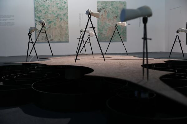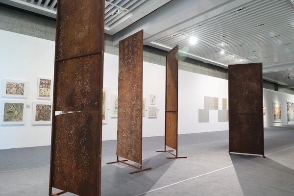 除了架上创作外,此次展览还呈现了一系列装置、雕塑作品,艺术家翟小实作品《开启东方》展现了常书鸿、王子云、姚继勋、段文杰等为代表的一代先师,考察研究中国西北部古代雕塑与传统艺术的风采。刚猛的力士形象将艺术家们不屈不挠顽强的求索精神淋漓展现;艺术家朱玺作品《谋皮》,以厚重的铁板与圈叠的铁环,打造了一张锈迹斑斑的“虎皮”,一个个转动的圆规象征着曾经边塞战争中对土地的划分,在“虎皮”的刻线将大世界、大环境、山川家国与个体情感及生命串联起来,进行着跨越时空定义的度量。艺术家徐戈利用砂石相互摩擦的运动,模拟出海浪的声音,在展厅中营造出一片发光的海洋,将无垠的沙漠与海洋压缩在一起,带领观众在摇晃互动的过程中展开与山川湖海的诗意对话。