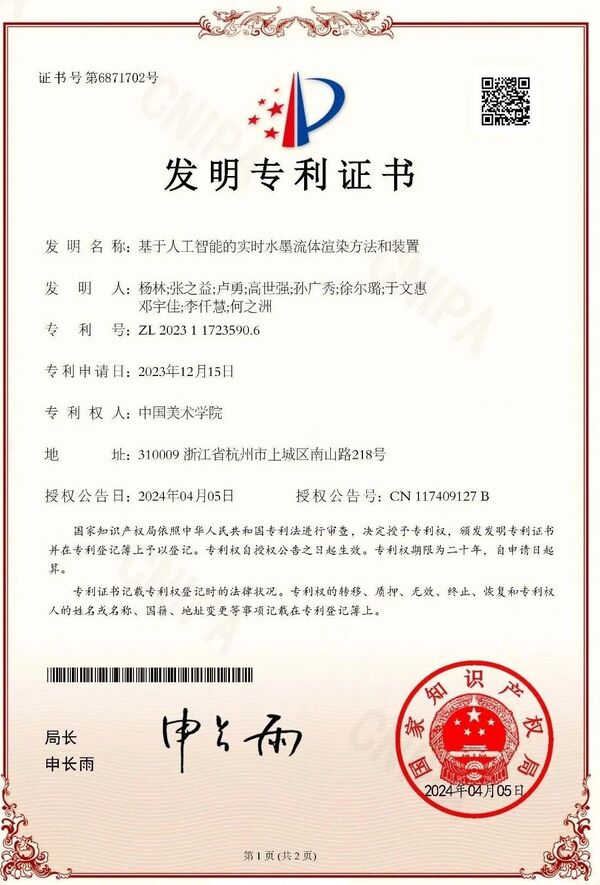 此外,中国美术学院视觉中国虚拟视觉与全息艺术研究中心师生(杨林、张之益、卢勇、高世强、孙广秀、徐尔璐等)通过数年艰辛研究,自创发明了一项属于人工智能技术领域的技术专利——“基于人工智能的实时水墨流体渲染方法和装置”,于2024年4月5日荣获国家发明专利。