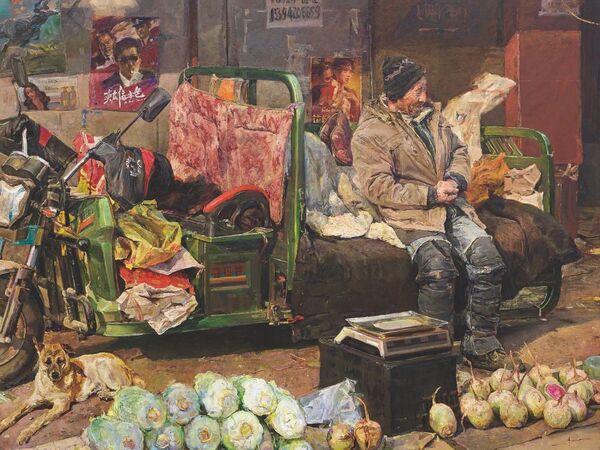这幅作品描绘了一位农民宁静、满足的生活状态,他悠然自得地守护着他平凡而幸福的生活世界。儿时的菜场在冬日的暖阳下依旧如初,温暖的场景仿佛让眼前的人成为一位久违的故人,既像儿时的玩伴,又似少年的挚友。遥远而又熟悉的童年记忆被唤起,于是感动化为画面,凝固成为《千里故人》。