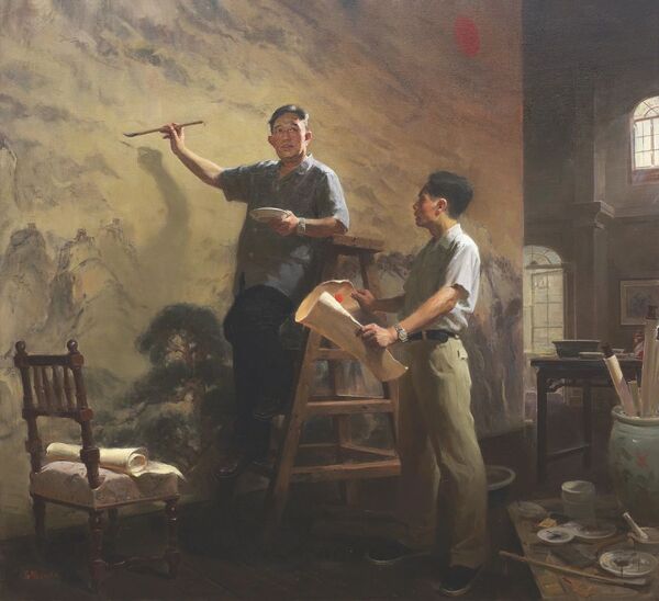 这幅作品鲜明反映了在新中国成立十周年这一具有深远意义的时刻,对傅抱石和关山月两位艺术家致敬。作品画面采用仰视视角和稳固的三角构图,展示了艺术家的磅礴气势,采用了逆光的手法,赋予了画面一种庄严和崇高的氛围,引领着观者进入那个充满激情和创造力的时代。