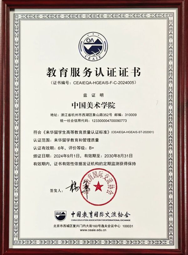 10月31日,第25届中国国际教育年会在北京举行。年会上举行了来华留学生高等教育质量认证颁证仪式,中国美术学院获颁来华留学生高等教育质量认证《教育服务认证证书》,在初次认证中取得了最佳成绩,被评为B+等级并获得6年的认证有效期。作为中国首所接受此类认证的艺术院校,我校将以此为契机进一步推动来华留学事业高质量发展。