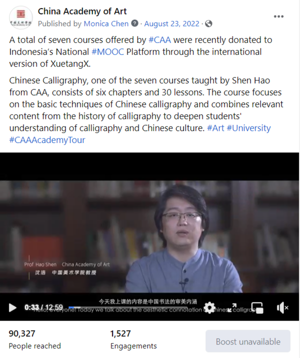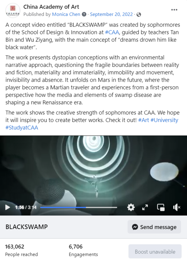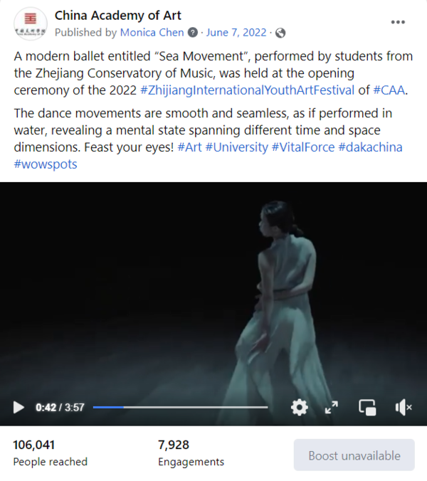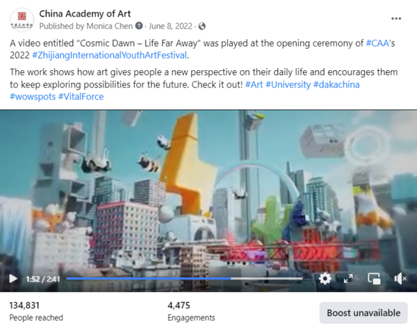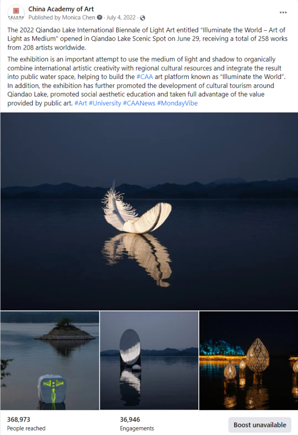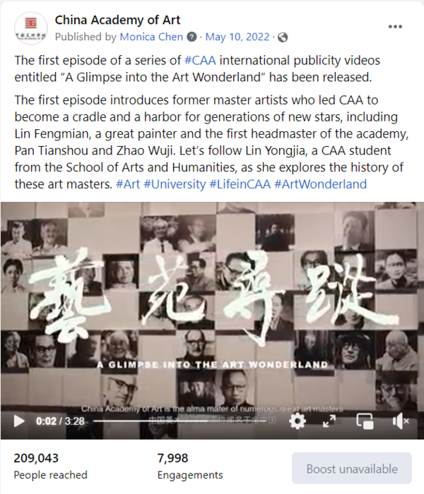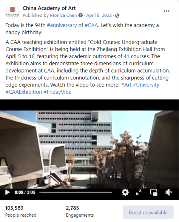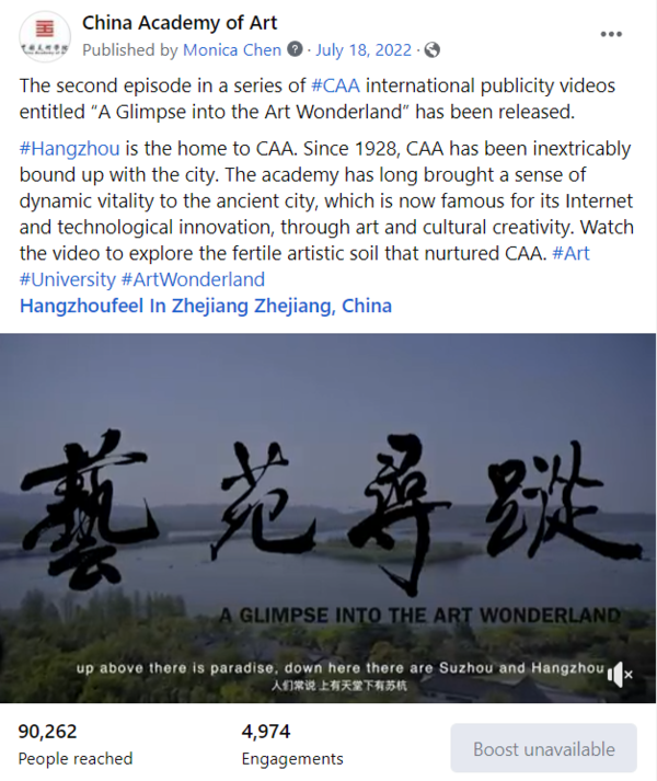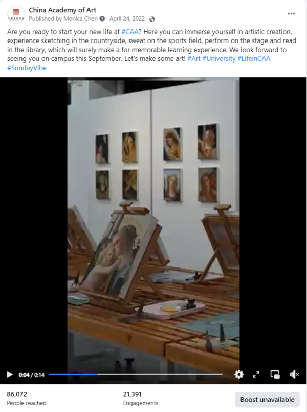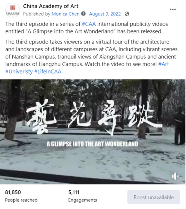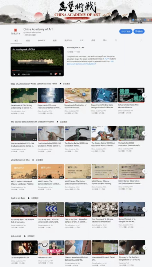 截止2022年12月,中国美术学院海外社交媒体平台粉丝量达28.58万,共计发稿1,620篇,视频321个,帖文阅读总量超2314万,互动总量58万+,视频播放量55.5万+。其中Facebook账号年度增粉3.21万,全年帖文传播量超1007万,同比上升19.9%;Instagram账号年度增粉1.4万,全年帖文传播量超1009万,同比上升114.8%。