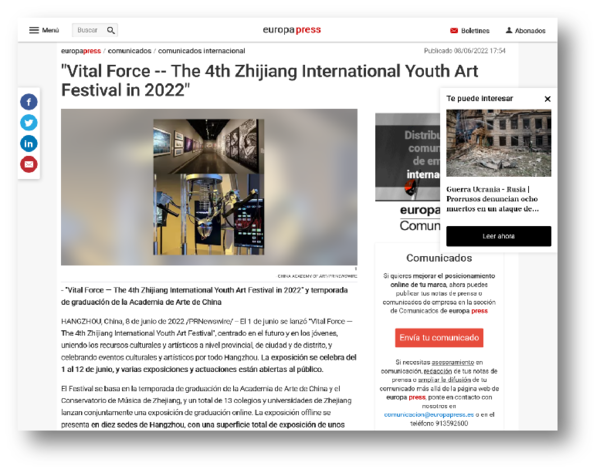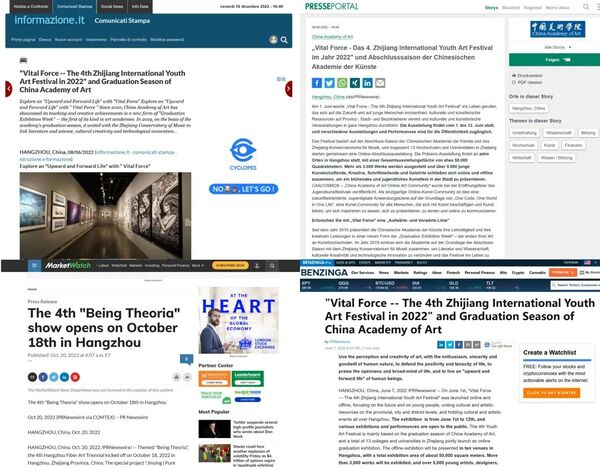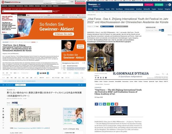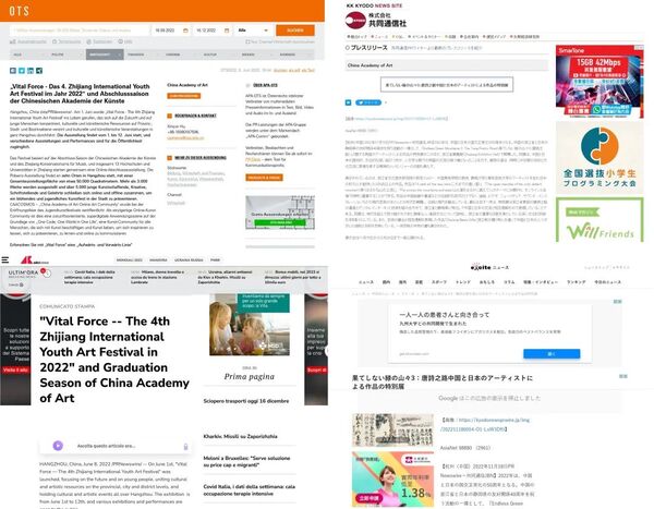 2022年中国美术学院海外传播积极探索传播模式、拓新传播渠道、优化传播内容,主动发声、借嘴发声、多层联动,做大做强内容、平台、效果、对象,全方位提升海外传播效能。联合Times泰晤士报、AP News美联社、Europa Press西班牙国际新闻通讯社、APA-OTS奥地利通讯社、Asahi Shimbun Digital日本朝日新闻等海外大众合作媒体,e-flux、ELIA、Flash Art (Italy)、Universe in Universe、Vanguard Gallery、CGMagazine等海外专业合作媒体,发布英、法、德、西班牙、日语等多语种稿件,落地覆盖美国、英国、西欧、日本等多国和地区,新闻刊发后第一时间被Google完整收录,总计转载落地3000+家媒体,曝光总量达22万+次。