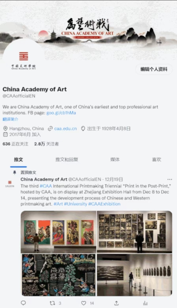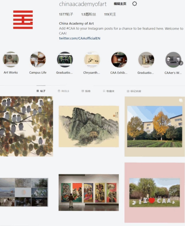 报告评价:中国美术学院在Instagram上利用学科优势,致力于弘扬包括书法、国画、剪纸等在内的中华优秀传统文化,将发布内容融入中国传统文化的视觉符号,打造中国名片,讲好中国故事,弘扬中国精神。