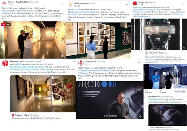 第四届之江国际青年艺术周期间,中国美院与中央网信办指导的全国性网络国际传播主题品牌合作,以“浙江生活力”为主题,以直播、短视频、图文形式,以#DakaChina #WowSpots #VitalForce为话题进行全网传播,“印象浙江”新媒体矩阵累计发帖34篇,建立网站专题页面1个,推出打卡短视频1支;中国美院新媒体矩阵累计发帖40篇,包括直播系列帖文6篇,探馆和展览系列帖文34篇,制作探馆短视频13个。截止6月12日,青艺周相关话题和内容曝光量超73.3万,视频类内容总阅读量超65万,视频观看量超5.6万。