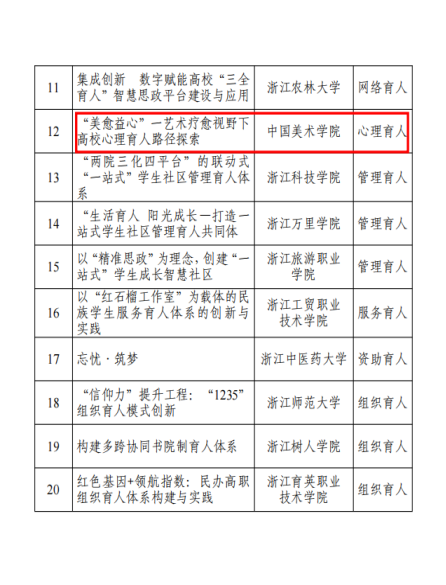 近日,中共浙江省委教育工作委员会公布“浙江省第一批高校学生心理健康教育工作标准化建设”实地调研结果,中国美术学院获评“心理健康教育工作标准化建设示范高校”。