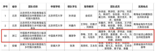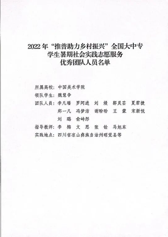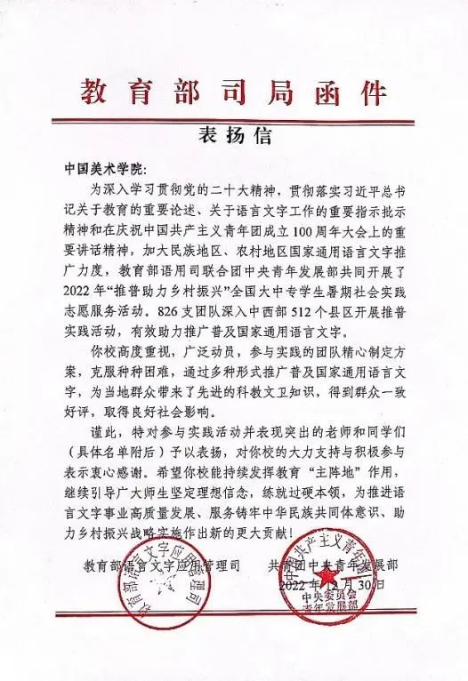 近日,中国美术学院“赴四川省凉山彝族自治州推普助力乡村振兴志愿服务队”获全国大中专学生暑期社会实践志愿服务活动“优秀团队”称号,并获教育部语言文字应用司和共青团中央青年部来信表扬,充分肯定了学校师生团队在推普社会实践志愿服务活动中的贡献,对表现突出的老师和同学予以表扬,并对学校的大力支持与积极参与表示衷心感谢。
