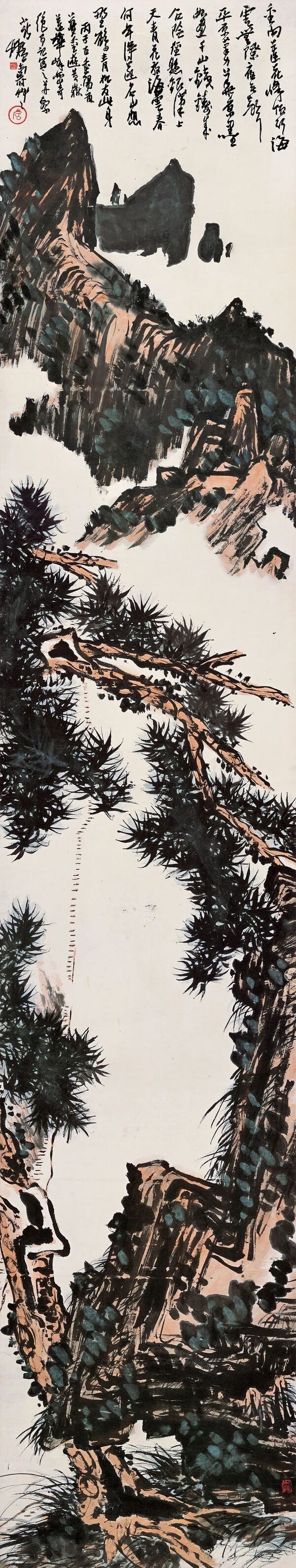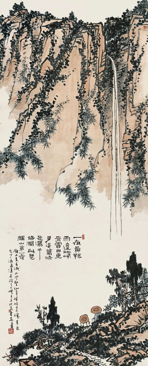 《雁山第一奇图》 潘天寿 纸本 设色 纵184.8厘米 横74.8厘米 20世纪50年代末 中国美术学院美术馆藏